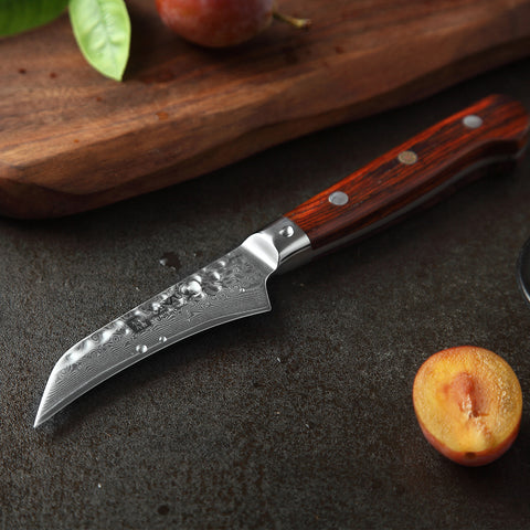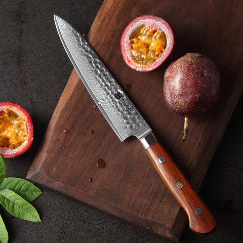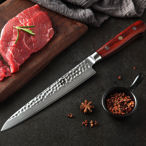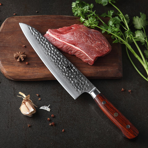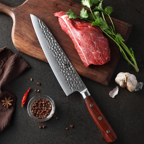 The outer Stainless Damascus layers and inner core combine for a total of 67 layers. This helps ensure durability and consistency in the blade’s internal structure. Combined with the expensive heat and cryogenic freezing, coupled with impeccable Rosewood Handles, the knife's quality is repeatable across the entire line.