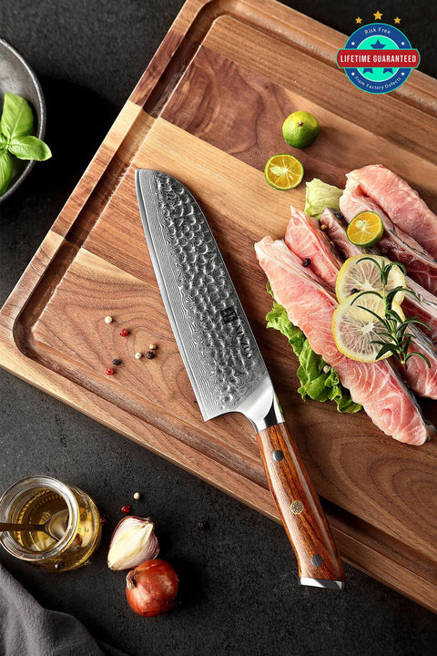 Both Hezhen and Xinzuo knives have a lifetime warranty against blade delamination and handle breaking or if a handle ever comes apart. However, the warranty does not cover negligence, such as putting the knife in the dishwasher, dropping it, or cutting it on hard surfaces.