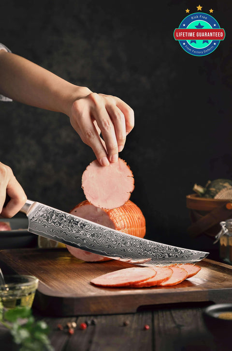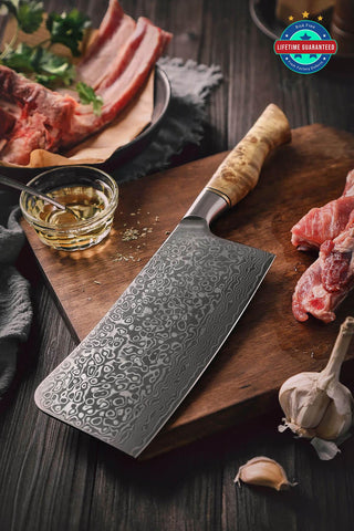 Both Hezhen and Xinzuo knives have a lifetime warranty against blade delamination and handle breaking or if a handle ever comes apart. However, the warranty does not cover negligence, such as putting the knife in the dishwasher, dropping it, or cutting it on hard surfaces.