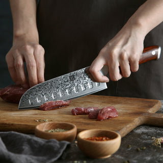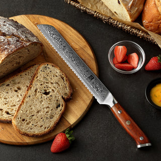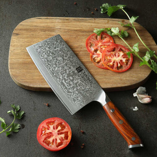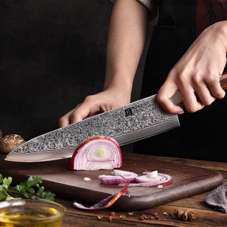 The outer Stainless Damascus layers and inner core combine for a total of 67 layers. This helps ensure durability and consistency in the blade’s internal structure. Combined with the expensive heat and cryogenic freezing, coupled with impeccable Rosewood Handles, the knife's quality is repeatable across the entire line.