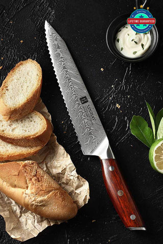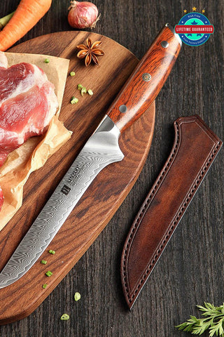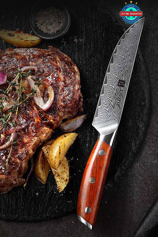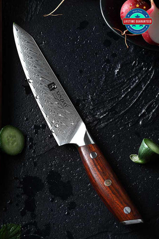 Both Hezhen and Xinzuo knives have a lifetime warranty against any manufacture imperfections like the Damascus eliminates etc. The warranty does not cover negligence, such as putting the knife in the dishwasher, dropping it, or cutting it on hard surfaces, etc. Treat your knives as quality chef tools; they'll serve you for many years.