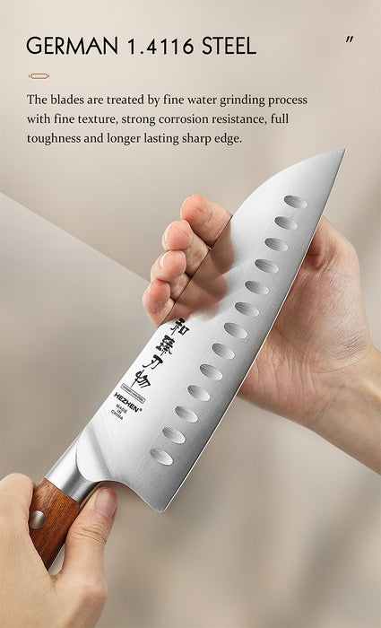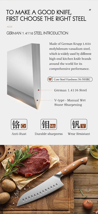 Crafted from premium German 1.4116 stainless steel (X50CrMoV15), the Xinzuo X02 Santoku knife delivers exceptional toughness, corrosion resistance, and long-lasting sharpness.This high-performance steel—trusted by top brands like Wüsthof for over 200 years—ensures razor-sharp precision while being incredibly easy to sharpen for everyday use.