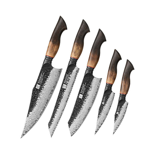 Xinzuo X06 5 Pcs Chef, Santoku, Bread, Utility & Paring Damascus Knife Set Burnt White Oak Handles