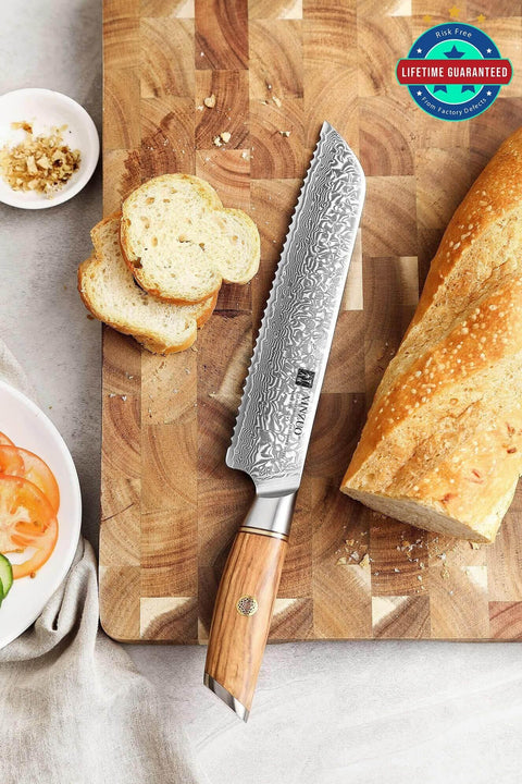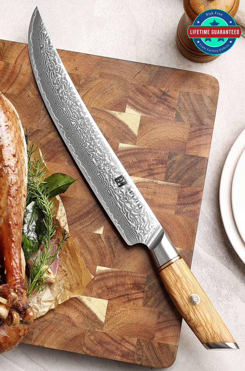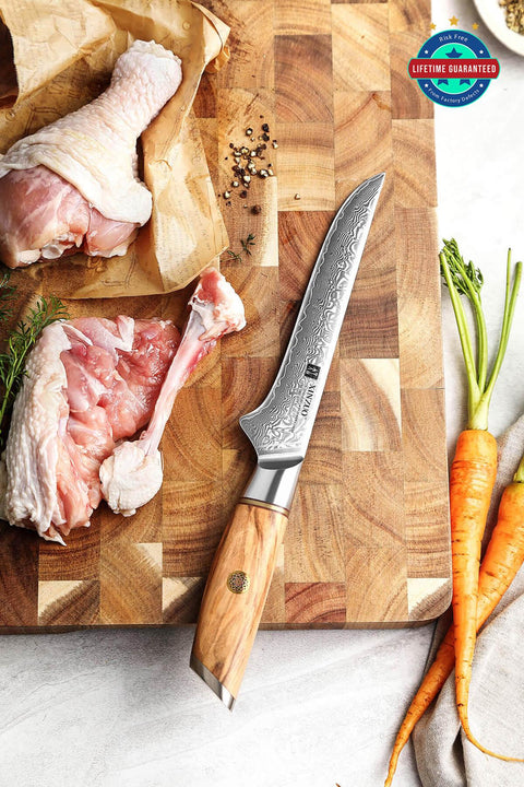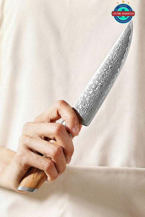 These higher-end Damascus knives would make a great addition to your collection. Knives are made up of three major sections of steel and fitted with durable Olive Wood handles. The primary core that serves as the cutting edge and two outer Damascus protective sections help prevent rust buildup. However, you should still regularly clean and dry your knives before storage.