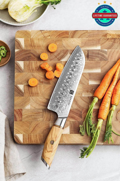 Hand-rubbed Olive Wood has a very smooth, naturally shiny surface. Olivewood dries out more slowly than most other woods but occasionally needs a little olive or mineral oil hand-rubbed. With a bit of maintenance, your knives should last for decades. These ergonomic handles also feature a flower design made from copper rivets that gives them an elegant finish. While beautiful, they are good for balance and a firm grip in your palm.