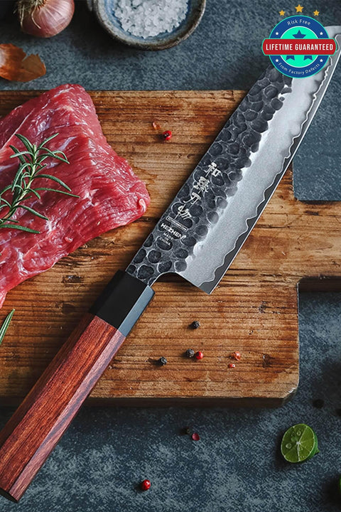 Starting with 60-61HRC, adding rare metals provides excellent anti-corrosion, anti-rust, and toughness properties. The high-quality blade is paired with a classic Japanese-designed octagonal handle known for its ergonomic design. The blade is incredibly strong and stable, and its razor-sharp edge can be maintained for months of frequent daily use. With this outstanding sharpness, you can easily slice through meat and vegetables as thin as you like, and it has an ergonomic design for comfort and long use.