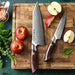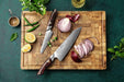 The Damascus Chef Knife has a 8.5 inch or 215.9 mm blade and is the primary cutting tool of your kitchen. Meat, vegetables, fruits, and everything short of cutting bone are within the capabilities of your chef knife.