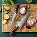 The Damascus Utility Knife has a 5 inch or 127 mm blade and is more than likely the second most used knife in your kitchen. This handles all the cutting tasks your chef knife might be too large for. Deboning meat, rough chopping vegetables, and preparing fruits are within this knife style’s uses.