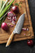 The knife blade features a 65° upturned point. This angle helps ensure the knife slices better. It also helps maximize the use of the “rocking” cutting technique. The edge is 15° on either bevel which is often referred to as the “Golden Angle.” This angle balances sharpness and durability allowing you to cut meats and vegetables easily.
