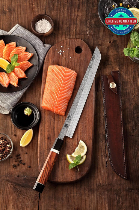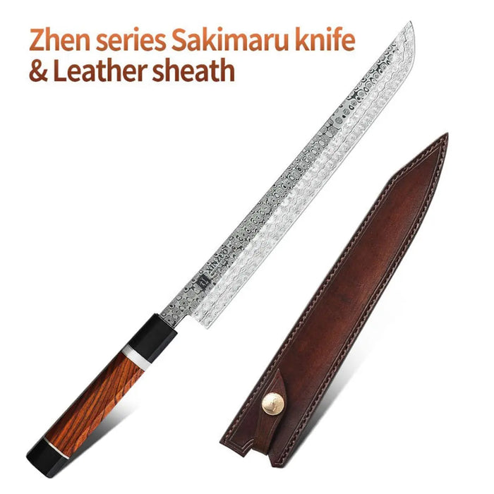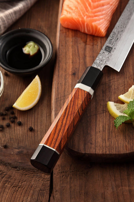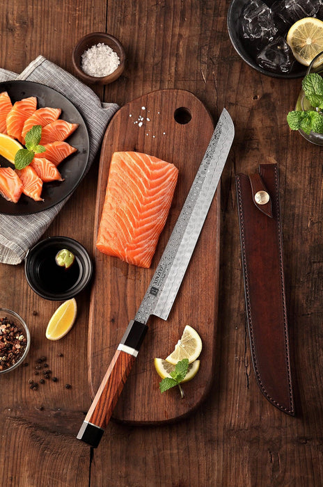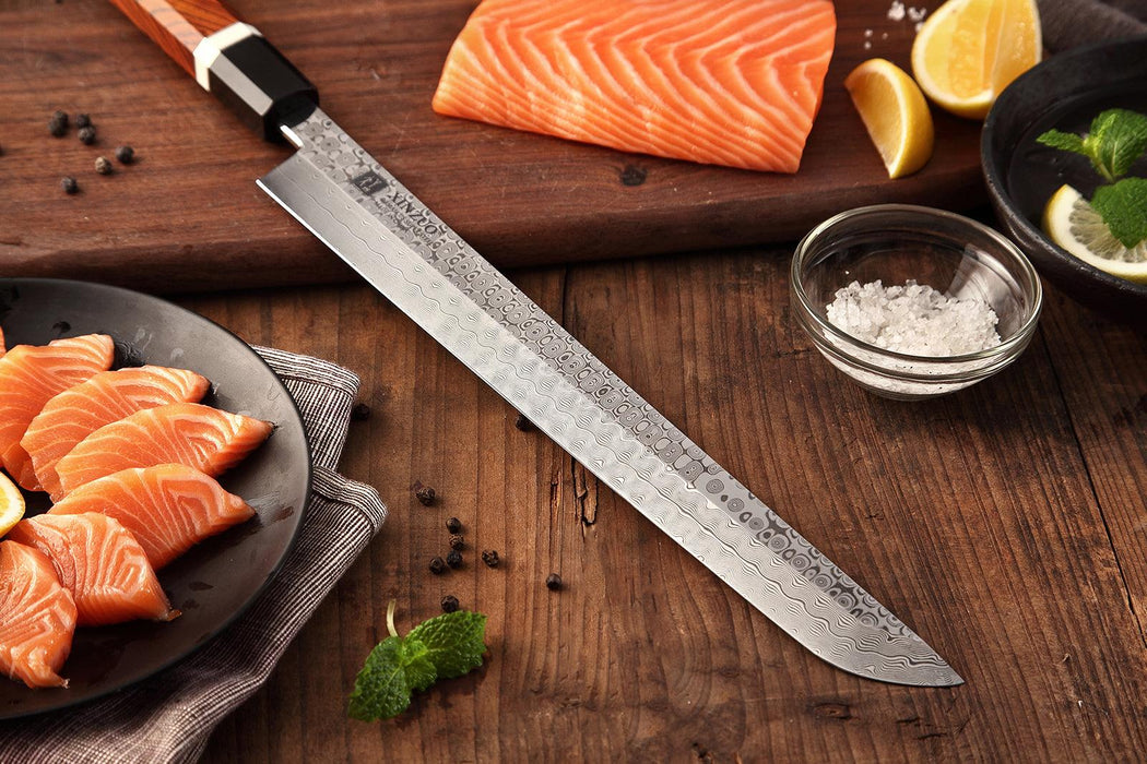 An amazing meal needs an amazing knife to prepare it with. The Xinzou F3 Sakimura is designed to provide high quality performance while being a work of art. This blade is traditionally referred to as a Sakimura Takohiki and is a type of sashimi knife.