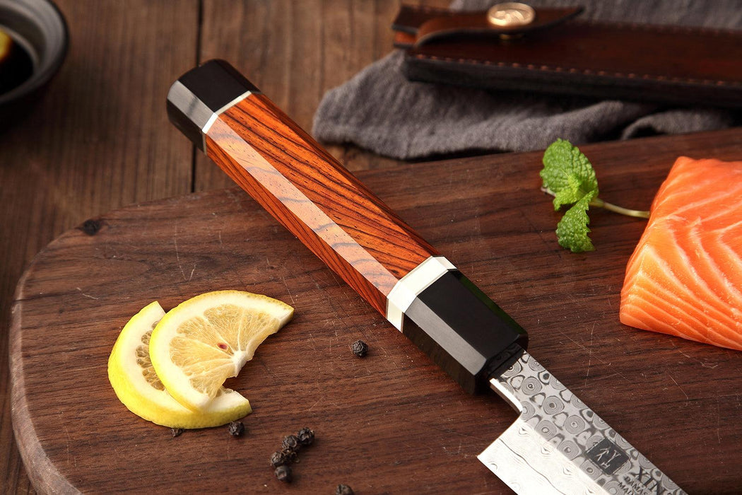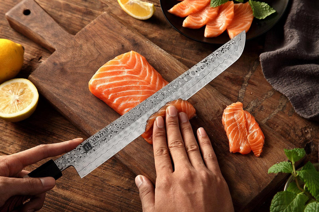 Sashimi knives need to be able to cut extremely thin slices of meat and fish in order to preserve the flavor. This is achieved by the very narrow, high carbon steel blade.