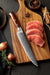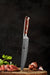 The 8 inch Damascus Steel Carving knife is for your largest meat cutting tasks. The long blade and relatively narrow profile allows for continuous slices that produce cleaner portions. Carving knives can be used before and after cooking and focuses on things like turkey, roasts, and legs. Things that are mostly meat and not bone.