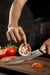 The core is made up of 10Cr15CoMoV Powder Steel. This allows for a very consistent edge that is hardened to 58-62 on the Rockwell scale. This hardness range is the sweet spot of kitchen knives. The edge won’t be too soft or too hard which prevents the edge from chipping or rolling.