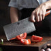 The 7 inch Damascus Cleaver Knife is made for vegetables. While it may look like it’s made for working on meat and bone, this cleaver is actually designed for large amounts of vegetables. Similar to Nakiri blade, chopping a lot of vegetables like leeks, onions, and cabbage is easier to do with the large square blade.