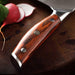 The handle features Stainless Steel accents, Rose wood handles, and a decorative brass medallion. The hard edges have been dehorned for comfort and ergonomics, allowing for long term use.