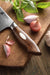 The handle is also made from North American Desert Ironwood and a Synthetic Ox Bone decoration. This offsets the beautiful Big Rose Damascus pattern on the blade while also creating a durable handle that will last for a long time.