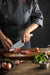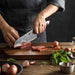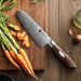 The 7 inch Damascus Santoku knife is more geared towards vegetables. Particularly things like cucumbers and lettuces, anything with a higher water content. The blade shape lets you cut very consistently and thinly making it a good beginner’s knife. It uses a rocking cutting method and works well on cooked meats in addition to its normal vegetable tasks.