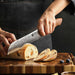 The 8.5 inch Damascus Bread knife is more like a serrated Santoku knife. This allows for a controlled method of cutting bread with thicker crusts than your standard store-bought loaf. Bread knives use their serrations to avoid crushing the bread and can be used on cakes, muffins, and bagels.