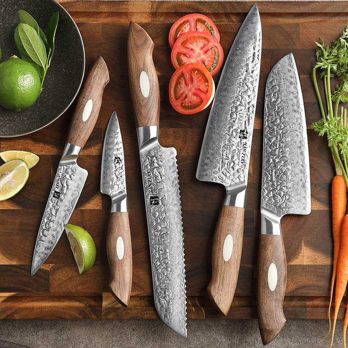 - Includes 8.5 inch Chef knife, 7 inch Santoku knife, 5 inch Utility knife, 3.5 inch. Paring knife, and 8.5 inch Bread knife.