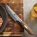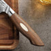 The outer steel layers also feature a beautiful Raindrop Hammered Damascus pattern off-set by an ergonomic handle made from North American Black Walnut and Synthetic Ox Bone. This makes the knife look good while allowing you to use it comfortably for a long time.