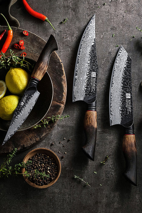 Xinzuo X06 3 Pcs Chef, Santoku & Utility Damascus Knife Set Burnt White Oak Handles