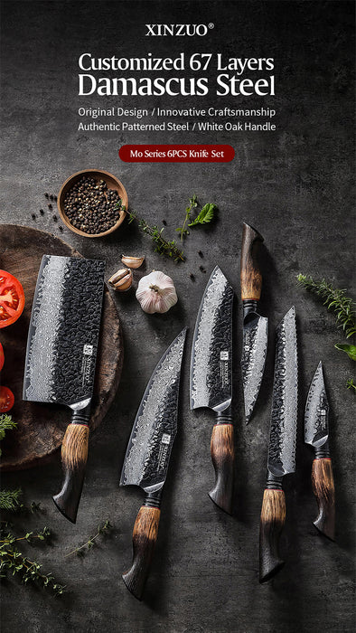 Xinzuo X06 6 Pcs Chef, Santoku, Bread, Utility, Paring & Cleaver Set Burnt White Oak Handles