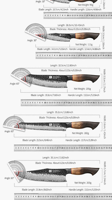From everyday prep to serious culinary projects, the Xinzuo X06 6 Piece Damascus Knife Set gives you the full arsenal to take on any task in the kitchen. This masterfully crafted collection includes a chef knife, Santoku, utility, paring, bread, and cleaver—each designed to handle everything from precision slicing to heavy-duty chopping. Whether you're trimming herbs, filleting fish, breaking down poultry, or carving a roast, there's a blade built for the job. Forged from 67-layer Damascus steel with ergonomic burnt white oak handles, this set delivers balance, power, and beauty in every cut. Conquer your kitchen with total confidence.