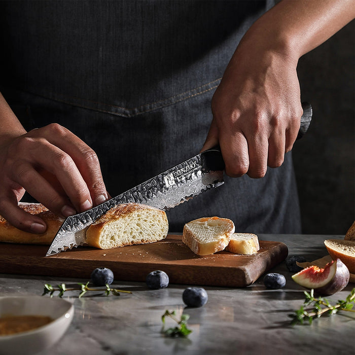 Engineered to conquer crust and crumb alike, this 7.4” bread knife features a long, serrated Damascus blade that glides through loaves without tearing. Its razor-sharp teeth and balanced burnt oak handle deliver clean, effortless cuts—whether you're slicing artisan sourdough or soft brioche. Precision-baked for those who take bread seriously.