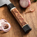 The core is sandwiched between two sections of SUS405 Stainless steel. While ZDP-189 is moderately resistant to corrosion, SUS405 has better anti-rust capabilities. This means the primary cutting edge is made from the sharpest steel variety while the rest of the outer knife portions are more rust resistant.