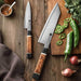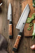 The 8.3 inch Chef knife is more of a Kiritsuke style. This traditional Japanese blade style is often used for sashimi knives or general purpose kitchen knives. The edge focused tip and long blade allow for long, clean cuts. It also allows for better rocking cuts and good drawing slices.